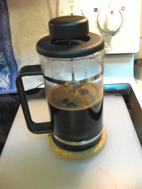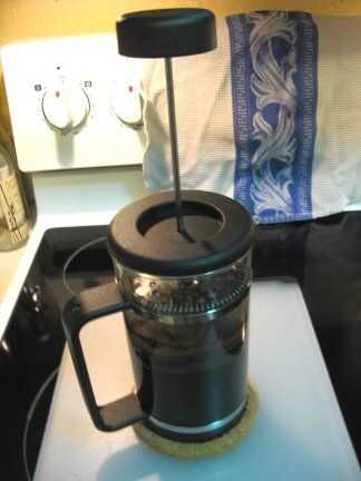 Para la prensa del café, simplemente empuje la empuñadura hacia abajo tanto como sea posible. Si usas un colador forrado de tela, el escurridor (colador) sobre un tazón, vierta el café, jardines y todo, en la estopilla y los lados de la tela, formando el café molido en una bola. Giro y apriete!