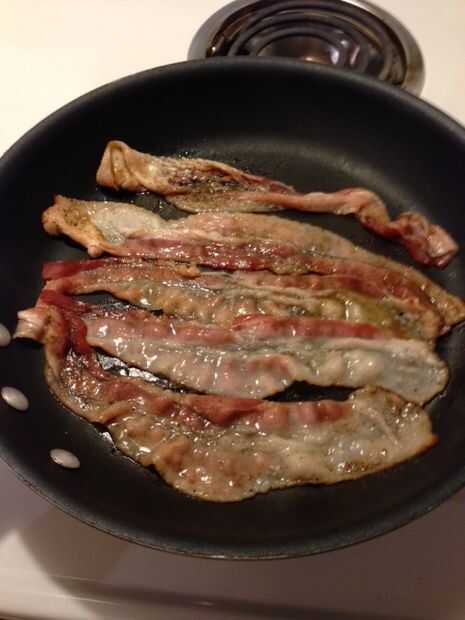 Pone bacon tan plana como sea posible en su sartén o plancha. Set cocina o plancha a fuego medio y no cualquier superior. Para obtener el mejor resultado de su tocino no debería verse como la pieza superior del tocino en la imagen de arriba, sino más bien como las otras cuatro piezas de la imagen.