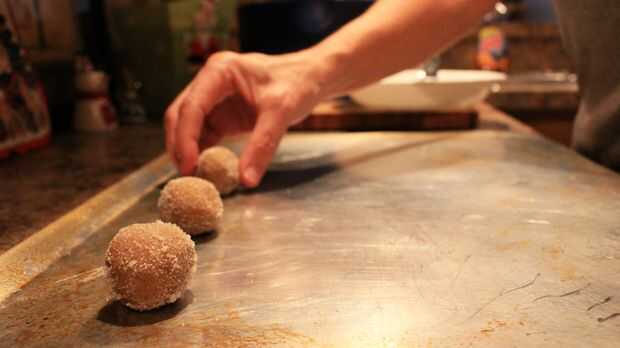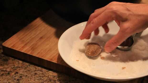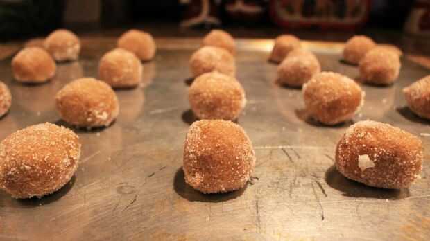 Alguna masa, aproximadamente del tamaño de una nuez y rodar en una esfera. Tomar esa esfera y rodar alrededor en su nivel de azúcar que está cubierta uniformemente. Ahora coloque su bola de masa recubiertos de azúcar en una bandeja de horno. Precalentar el horno a 350° F / 175° C mientras el rodillo y cubrir sus bolas de masa restantes.