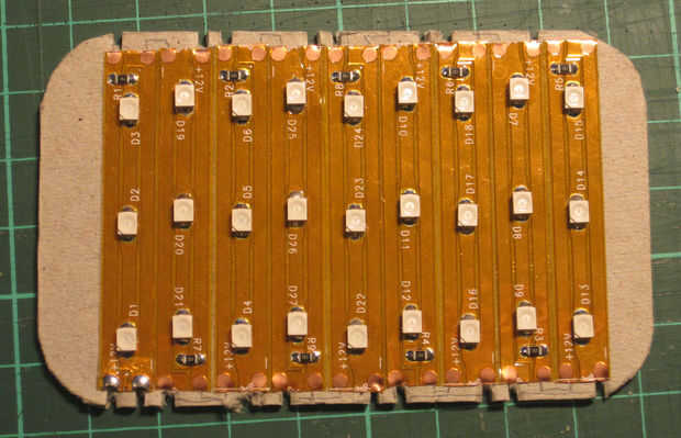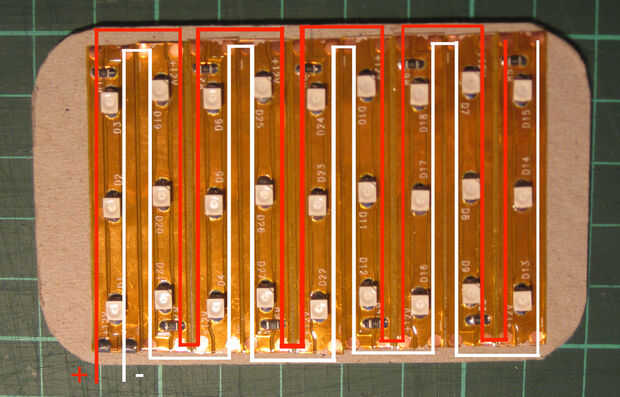 Donde a + terminal es junto al + terminal quiere conectarse (o - siguiente generación-), es fácil de conectar: un pegote de soldadura y usted está allí. Pero simplemente no se puede conectar todos los terminales a sus vecinos de cercanas, o no tienes un circuito en la placa. Algunos terminales tienen que ser conectados a los socios más distantes. Ver la foto del tablero de LED con las líneas rojas y blancas para las conexiones necesarias para alimentar el tablero entero.
