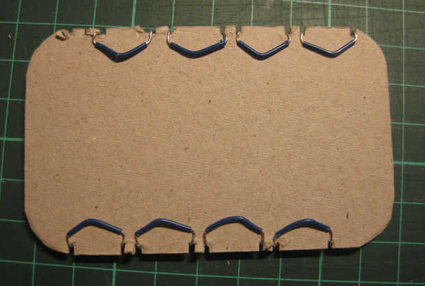 El siguiente paso es doblar el cable que usaremos para conectar terminales más distantes. Usé alambre de puente para el diseño, porque las porciones rectas de sean lo suficientemente largos para hacer ganchos que se engarce en el cartón. Los puentes que tenía eran demasiado amplias, por lo que los doblados al medio para reunir los extremos más cerca.