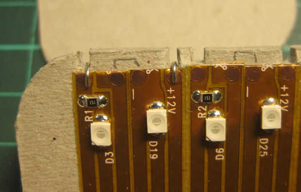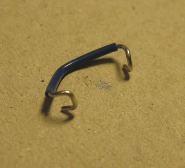 Si no tienes los cables puente, trate de usar alambre relativamente rígido doblado en la forma correcta. Cada pieza debe ser al menos 2,5 cm/1 "largo. Primera curva cuadrada U forma tan amplia como la distancia entre los dos terminales (mina eran 6 mm/1/2 "aparte) hace forma de C en cada extremo, sólo lo suficientemente grande como para enganchar alrededor de la cartulina y de la tierra en la terminal de la tira LED.