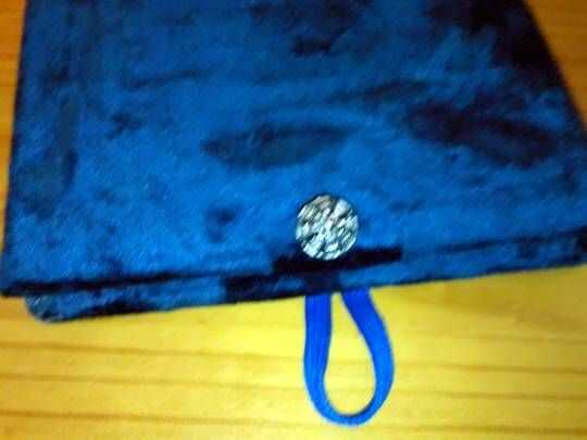 En primer lugar, cortar dos trocitos de terciopelo azul (aprox. 3 x 3 cm.). En uno de ellos, coser el botón de estilo del «Señor».