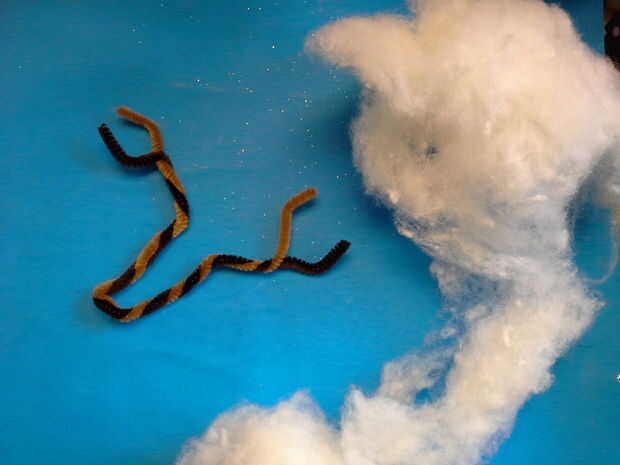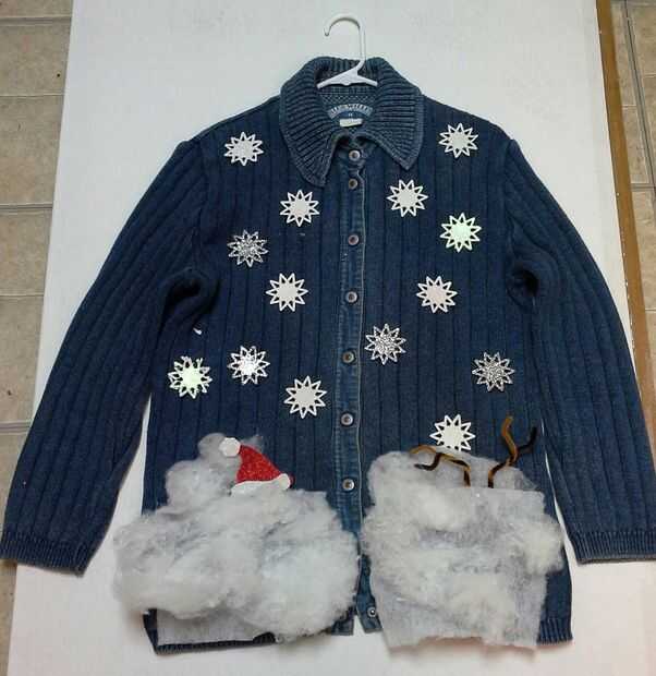 azul feo suéter de Navidad hecho con hojas de espuma de brillo, papel, limpiadores de pipa y relleno de fibra. Poner el relleno en la parte inferior del suéter. Scraggle relleno para parecer nieve. Forma juntos, limpiadores de pipa tan y marrón como las cornamentas de la torcedura.