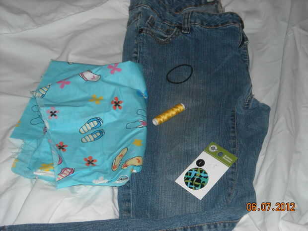 Lista de compras: Old Blue Jeans, hilo, botón, la máquina de coser (no obligatorio), sostenedor de la cola de caballo, tela (liner).