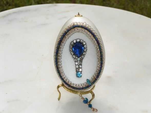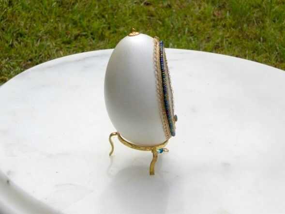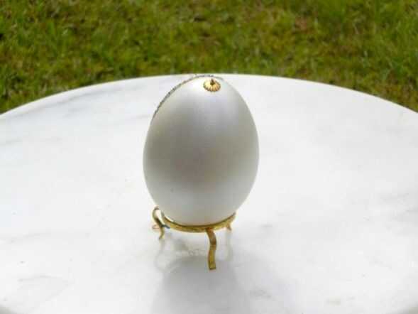 esto es un huevo real que tuvo muchas muchas horas para decorar. El huevo más grande de exterior tiene un pequeño huevo en su interior. Un cisne de cristal se encuentra en el huevo más pequeño. Hay muchos recortes detallados, apliques, cables metálic