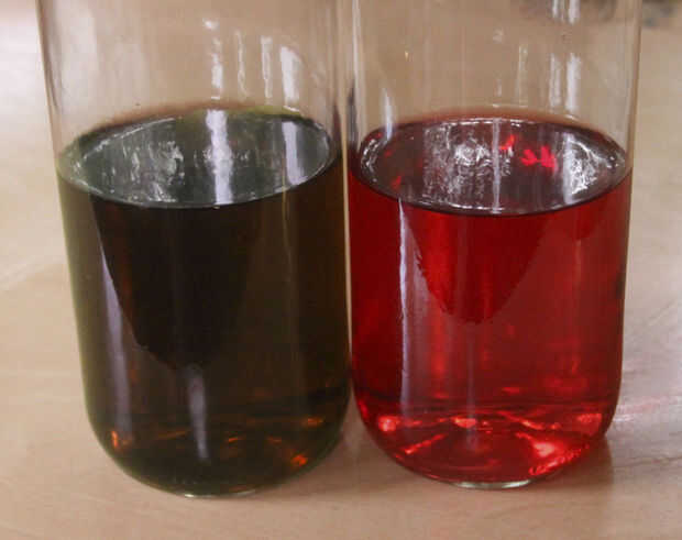 Pensé que sería una buena idea para ver si podría conseguir el color que van del rojo al azul por adición de una pequeña cantidad de escamas de hidróxido de potasio, así que pesa 0,1 g de la escama y había agregado a 1 litro de jugo azul. Hubo un efecto muy dramático y el color cambiada de rojo a oscuro verde! Utilicé papel de pH para comprobar que la bebida no sería perjudicial, no quería lo más fuerte que el pH 8. Obviamente, se trata de algo potencialmente peligroso para hacerlo usted debe saber cómo manejar con seguridad productos químicos peligrosos.