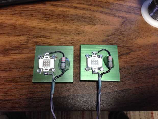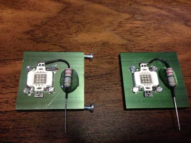 También he añadido un pequeño tubo termo retráctil para aislar la resistencia conduce. Un poco más tubería de heatshink y algunos cables de altavoz completa las luces. Tornillos de #10 encajará muy bien en las ranuras de extremo del disipador de calor para el montaje.