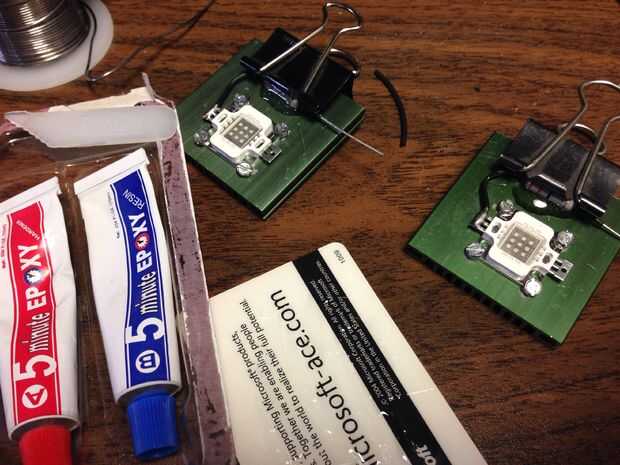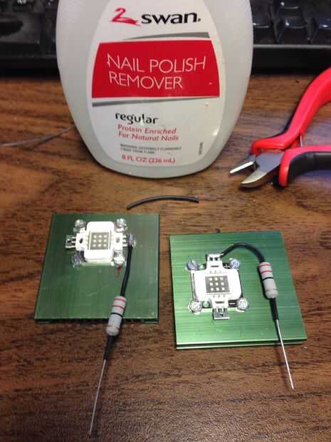 Usé un poco de epoxy para fijar la resistencia. Grasa de disipador térmico obtiene por todas partes así que uso un poco quitaesmalte para limpiar la superficie antes de pegar la resistencia de abajo. Usé una vieja tarjeta de identidad como una pequeña mesa de mezclas para el epóxido. Guardo un montón de estos por parte. Usé un clip binder para mantener la resistencia en su lugar como el epoxi secado. Asegúrese de que la abrazadera que utilizas no agrieta el cuerpo del resistor.