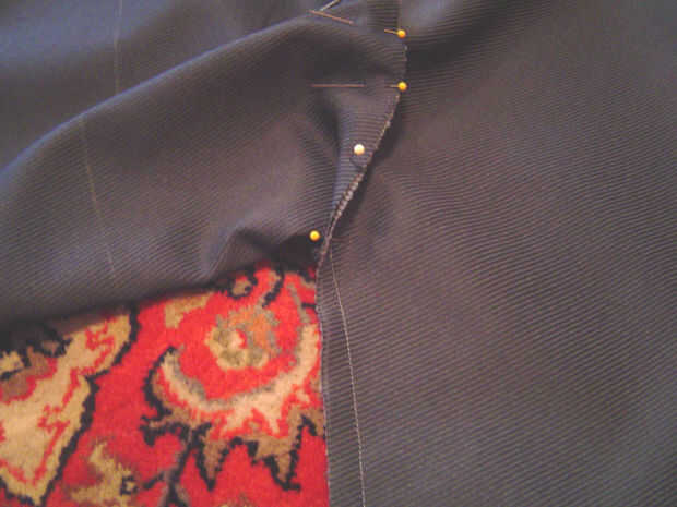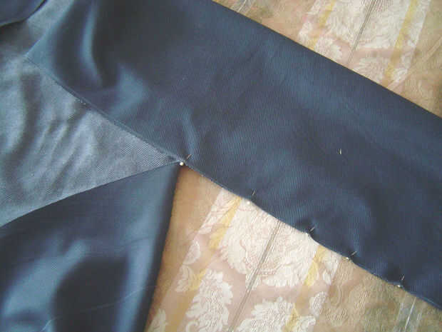 Se trata de cómo se construye la capa.   Primero cubrió y cosieron las costuras de la manga, derecho contra derecho.  Utilicé una costura de 1/2" y afilado para nada en el debajo del brazo.