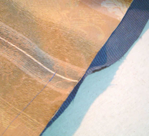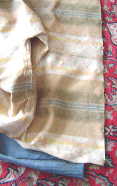 Con derecho al borde inferior del revestimiento y la capa del perno juntos.  Coser con un dobladillo de 1".  Deje un 10" apertura alrededor de la espalda media.
