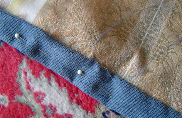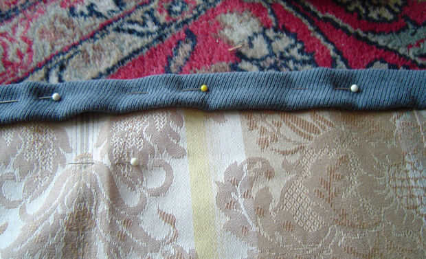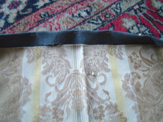 Vuelta en parte sin costura del dobladillo 1".  Traer el borde cortado de la tela de la guarnición hasta el borde dado vuelta para arriba.  Doble dobladillo guarnición y prender.  Capa de punto mano a forro.