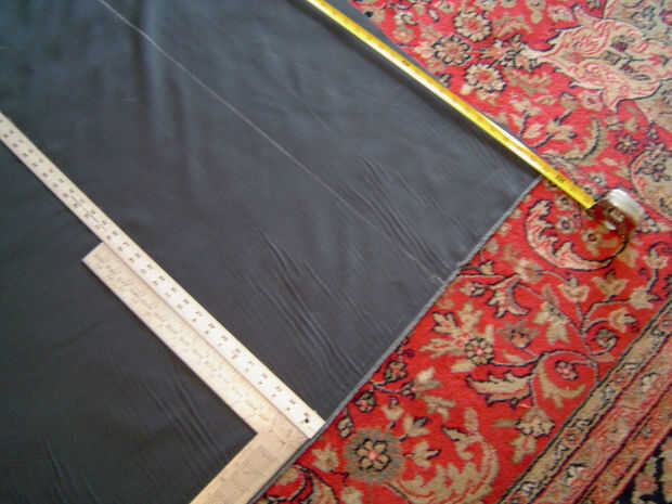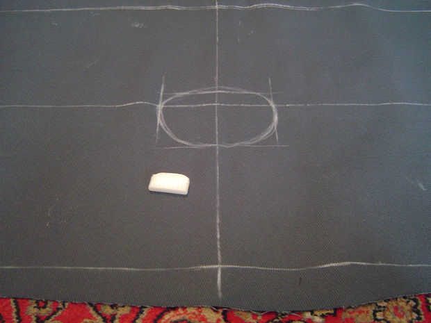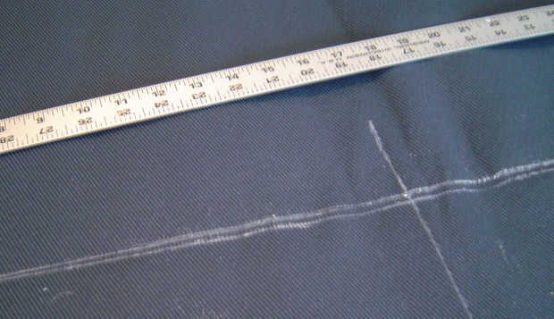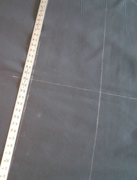 Ahora Mida y marque el centro de la anchura de la tela.  Trace una línea perpendicular a las líneas dibujadas en la tela.  Se trata de la línea trasera central delantero/centro.