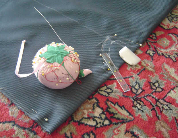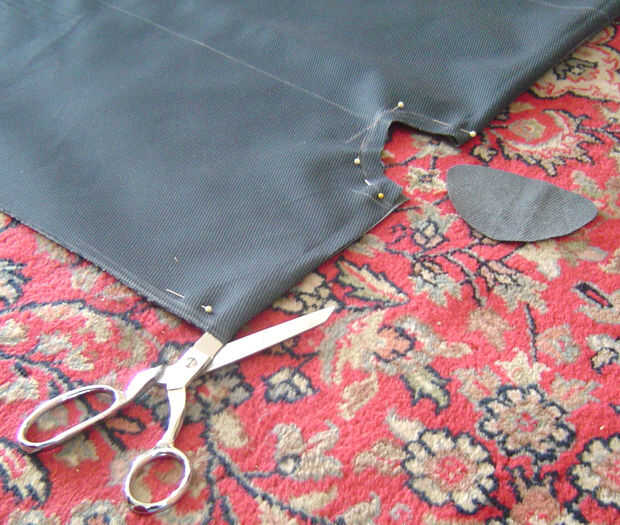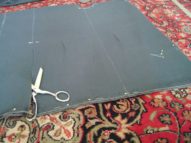 doblé la capa de en medio, derecho contra derecho juntos, a lo largo de la línea trasera y delantera.  Marcar un margen de costura de 1/2" dentro de la abertura del cuello.  Cortar la línea de frente de centro y la abertura del cuello.  Fijar todos los bordes juntos con cuidado y cortar la costura de la manga, que es 1/2 del ancho de la tela doblada.
