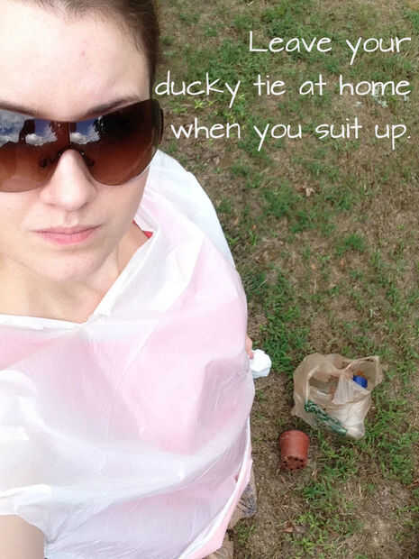 - Vístete! Tendrá que protegerse y proteger a sus botas de vaquero rojo. Use guantes, delantales, protección ocular, cubiertas del zapato y mascarilla si es necesario. Si no vas a conseguir el engranaje, entonces raid su stash de bolsas de plástico! Había pegado cada pie en una bolsa y había atada en el tobillo, llevaba una bolsa en cada mano como guantes y cortar cuello - y -los agujeros del brazo en una bolsa de basura grande para usar como un delantal. Me puse mis gafas de sol mayores como protección para los ojos. Estaba abierto al aire libre y no tenía viento para hablar, así que me di un paseo por el lado salvaje sin una mascarilla.