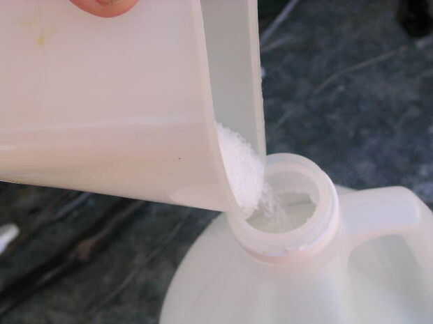 -Vierta la sal en el vinagre. Me gusta ponerla en la botella de vinagre, para que pueda ver si toda la sal se haya disuelto después de agitar. Si usted tiene un rociador de la bomba con una boca amplia, usted puede poner todos los ingredientes directamente en el pulverizador.