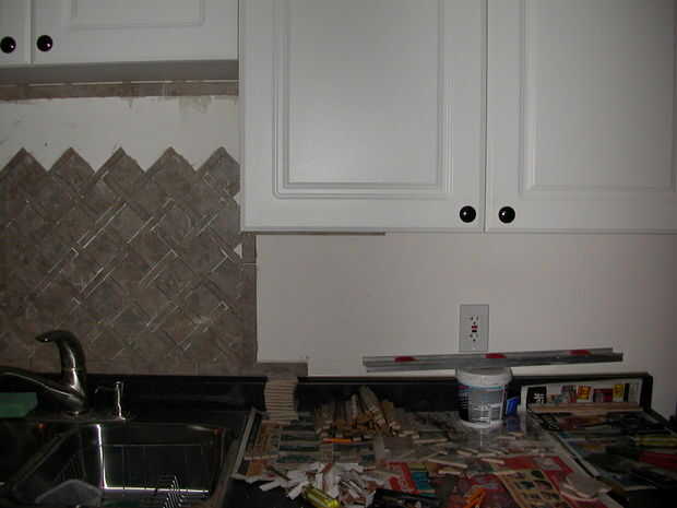 Esta imagen es la porción de salpicaduras detrás del fregadero. Comenzar utilizando la pared de la zona de fregadero con un borde de 1-1/4 de pulgada. La parte superior utilizar empalmes estándar mitre en las esquinas izquierdas y derecha, en la parte inferior requerirá un inglete doble para seguir el patrón de frontera en áreas adyacentes. Vea los pasos siguientes para obtener más información.