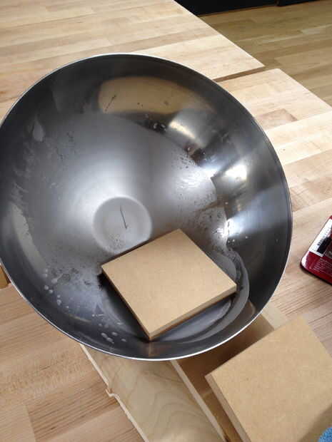 Inicio por la calefacción y por lo tanto, la fusión, cera. Puse la cera en un recipiente de metal y utiliza una pistola de calor para fundirlo.  Entonces coloqué el cuadrado de mdf en la cera caliente.