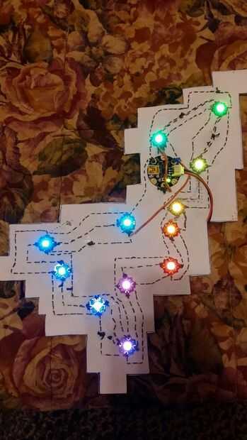 Una vez haya realizado todas las conexiones, tomar la 2 º forma de bateo. Esta pieza irá encima de su neopixels. En otras palabras, el lienzo se le intercala entre 2 capas de guata. Para fijar esta pieza de bateo, utilice un poco de pegamento caliente alrededor de los bordes. Dejar una abertura cerca de la Gemma para que todavía tiene acceso a ella y puede conectarlo a la computadora. También, asegúrese de que la batería tiene un lugar cómodo para sentarse. Puede que desee colocar la batería en la parte posterior de la pieza.