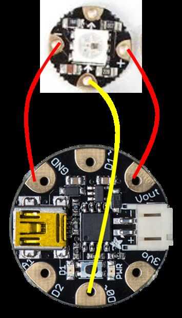 Cuando se conecta el pin D0 al pin de datos de pixel, te sugiero usar cable aislado. Esto permite la conexión pasar con seguridad sobre el tablero de Gemma. Puede conectar el cable a la Junta por soldadura. Si no tienes un soldador, hacer bucles en el alambre con los alicates y coserlas bien tocar el pin con el hilo conductor.
