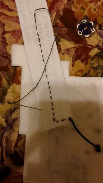 Utilicé los cables para hacer mis conexiones y luego cosió los cables hacia abajo en un pedazo de elástico. Luego levantó el hilo conductor a través del elástico y había conectado al sensor. La pieza elástica se extienda sobre el collar para que el sensor puede leer luz.