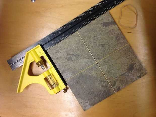 5/8 "x 5/8" o más pequeño. Utilizar bandas de goma y una regla para encontrar el centro de la loseta. Las bandas de goma puede envolver alrededor de la pieza y ajustadas. Una banda de goma se pueden estirar de izquierda a derecha y el otro de la tapa a la parte inferior de la baldosa. Use la regla para medir las posiciones de la banda de goma por lo que están centrados en la baldosa como se muestra.