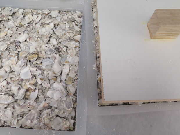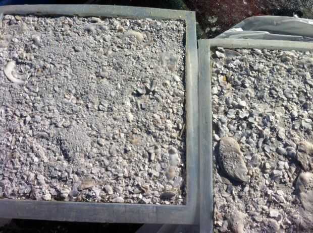 Añadir cáscaras de la ostra encima de esto mientras que todavía húmedo y pulse en el cemento.