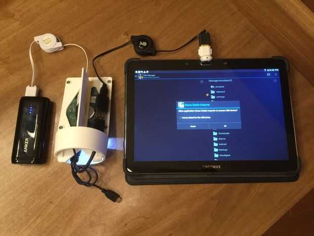 (3) Conecte todo y colocar componentes en taza como se muestra en las fotos: (a) unidad de disco con cable de alimentación especial (microB hembra conexión) a cable USB retráctil y posteriormente a 5V adaptador de corriente AC o batería; (b) unidad de disco con cable especial (conexión de USB tipo A macho) a conector hembra/hembra USB/USB, otro cable retractable del USB, conector USB OTG y más tarde teléfono/tablet Android; (c) al colocar los cables en la taza la parte 3D montaje impreso tiene un divisor para mantener los dos cables retractables del USB separados; (d) todo debe encajar dentro de la taza venti con tapa capaz de ajustar el completamente para el transporte.