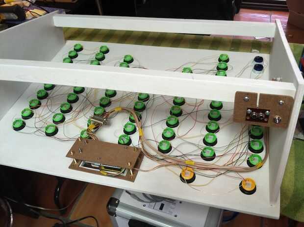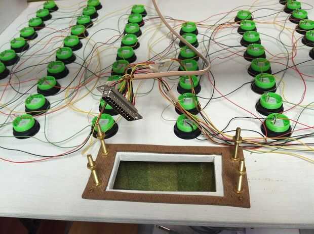 1.el panel del alambre a las líneas de escudo mux. Según los pasos anteriores puede conectarse las líneas de fila o columna desde el panel de las líneas de fila o columna en el escudo de mux. En la foto es la otra cara del conector DB25 a las líneas de fila y columna que coincida con el conector en el escudo de mux.