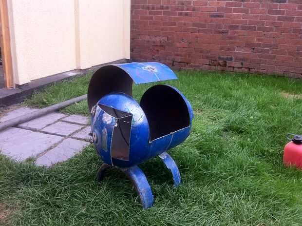 Vaciar la botella de gas, cortar el mango y la parte inferior, cortar el anillo usted obtener desde la parte inferior por la mitad y luego soldar las dos mitades para las piernas, cortadas una forma del tamaño deseado (no tiene que ser un cuadrado) de la parte delantera y una sección de la parte superior, creo que lo corte sobre la mitad redonda de unos 30 mm de las curvas en cada extremo , luego añadir las bisagras