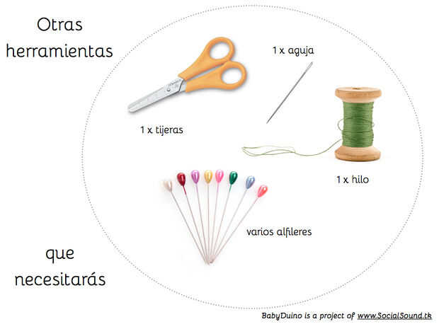 Revisa tienes todo lo imagen y antes de empezar ten a mano también unas tijeras, aguja, hilo normal y algunos alfileres.