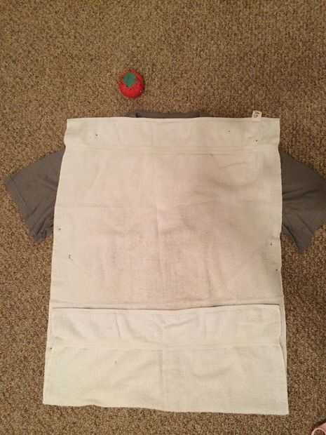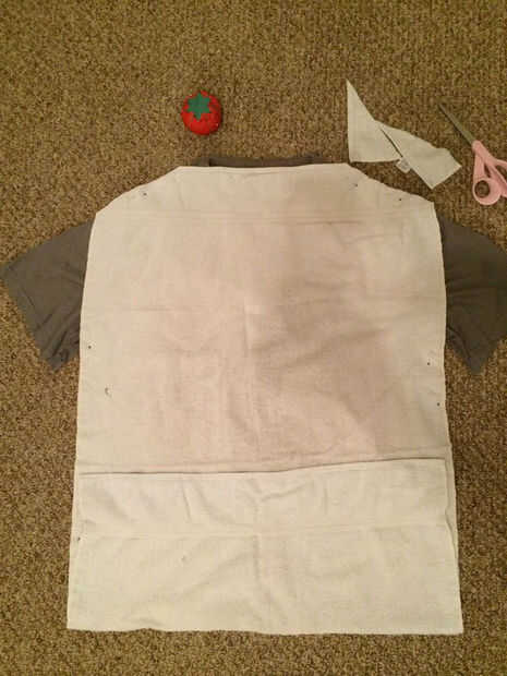 Ahora vas a cortar la toalla para adaptarse. Dejar la cara camisa abajo y poner la toalla encima de la camisa. Cortar las dos esquinas superiores por lo que alinea con los hombros en la parte superior de la camisa.