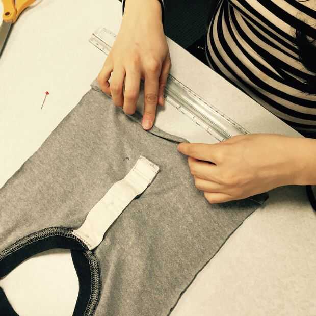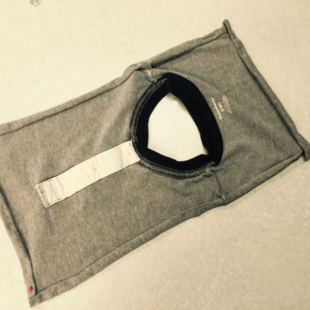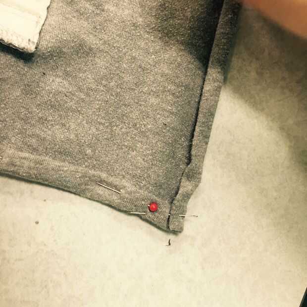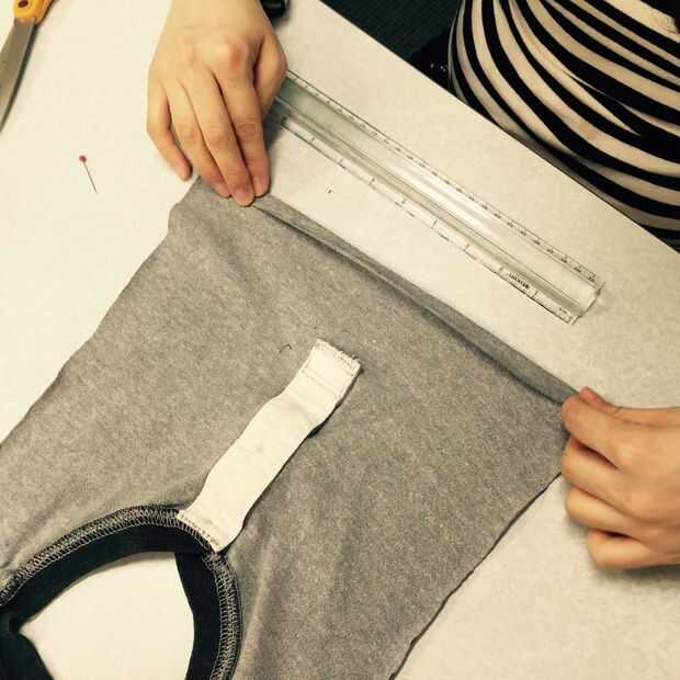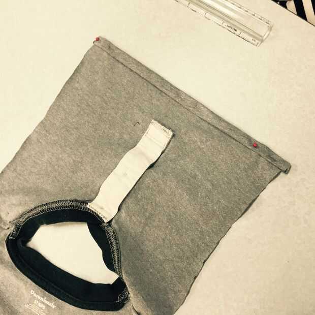 Gire la camisa de adentro hacia fuera y coloque sobre una superficie plana por lo dentro de la camisa es visible. Doblar el borde en la parte inferior de la camisa ½ una pulgada hacia el interior de la camisa. Doblar por segunda vez por 1/2 pulgadas para tener un doble pliegue. Perno de la tapa para mantener en su lugar. Repita este paso para todos los bordes crudos.