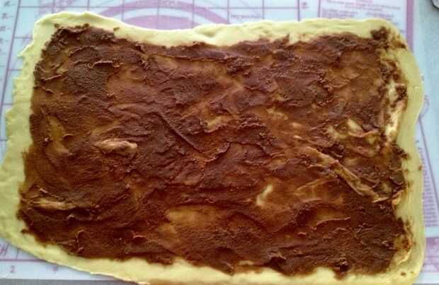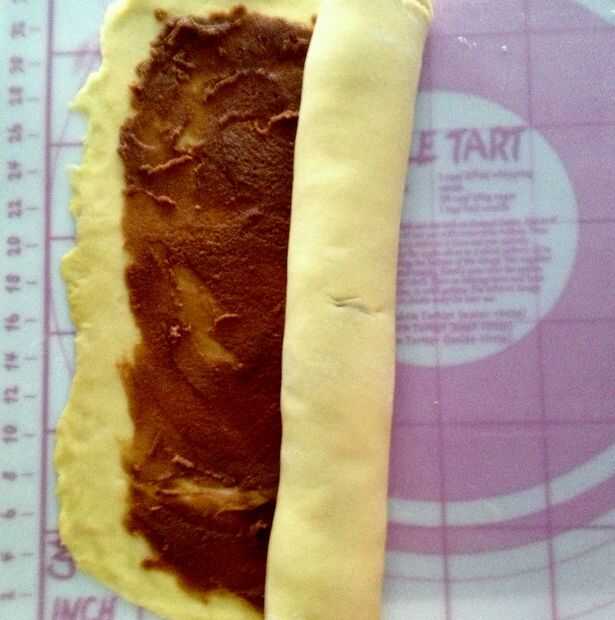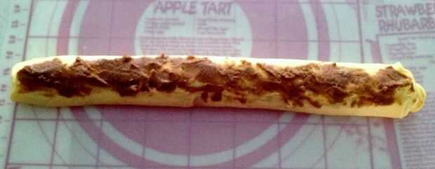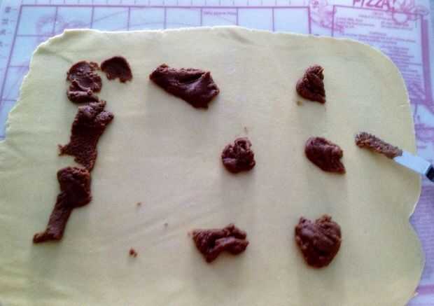 Aplaste la masa en la encimera enharinada. Estirar la masa en rectángulo de 20 por 14 pulgadas. Difundir todos menos 1 cucharada de relleno sobre la masa, dejando el borde 1/2-pulgada alrededor de los bordes. (Rollos de esta masa hacia fuera muy fácilmente, el separarse de relleno es más un reto; como se puede ver, masa piezas en la masa y la difusión del relleno sobre la masa usando una pequeña espátula offset, tarda unos minutos, sea paciente y algo suave.)