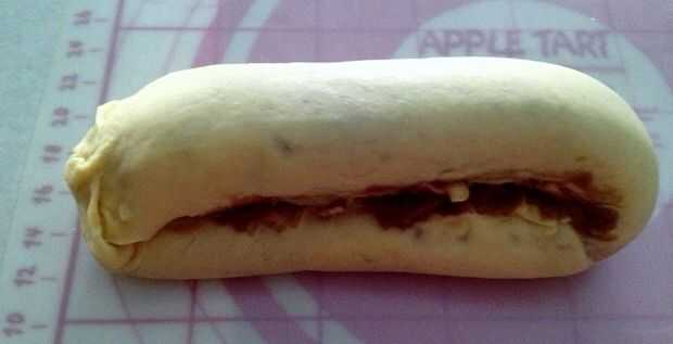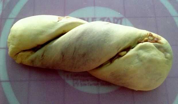 Extensión reservada de relleno sobre la parte superior del cilindro. Doble cilindro encima de sí mismo y pellizcar las puntas para sellar. Gire suavemente el cilindro doble dos veces para formar ocho doble.
