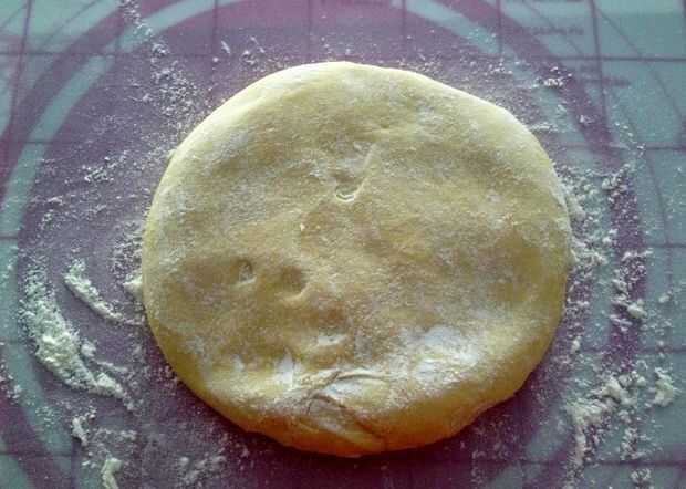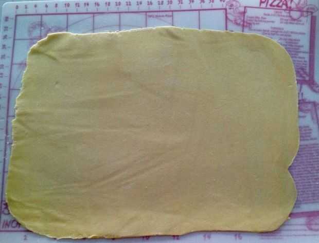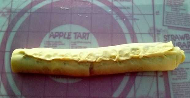 Trabajando desde el lado corto, enrolle la masa en un cilindro y un sujetador a lo largo de la costura a sellar. Cilindro de posición hasta la costura lateral y rodar hacia adelante y hacia atrás hasta que se extendió hasta 18 pulgadas de longitud.