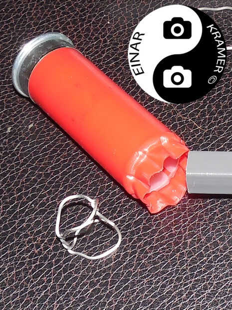 Corte alrededor de la mitad de la encrespadura con tijeras ya que hacer un prensado estrella en forma de redondos incluso es muy difícil con una cáscara de forma abierta, pero usando tarjetas de tiro y medio la presión es más fácil. Quería preservar algunas de la encrespadura para seguridad desde si la presión se ha ido, la babosa de cera puede deslizar en el cañón y crear una condición de carga peligrosa mecha. Hay putters de prensado para la venta que se abre la cáscara conservando algunos engarzado con un simple giro de la muñeca.