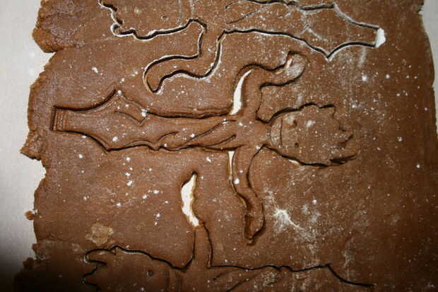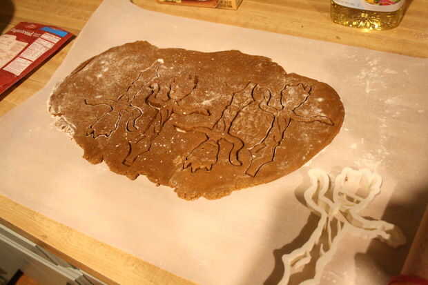 Cuando no cabrán más, pelar encima de masa para galletas de alrededor de las galletas de groot (deje el groots en lugar ya que son frágiles hasta al horno.) y recombinar en tazón de fuente entonces rodar hacia fuera en un nuevo pedazo de papel pergamino enharinado.