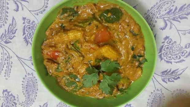 1.pan... 2 cucharadas de aceite... Fry babycorn capsi n hasta n marrón levemente dorada Retire 2. Salsa... En el mismo aceite... cebolla... un poco dorado agregamos pasta de ajo jengibre... cocinar bien fr 2-3 minutos... Añadir tomates cocinan hasta suave... Añadir msale chiles rojos pwd 1 cucharadita... sal... Haldi 1/4 de cucharadita... dhania 1 cucharadita... Jeera pwd 1/2 cucharadita... amchur pwd 1/2 cucharadita... Cuando masale bien cocido agregar kajus n molido con agua sme... quitar