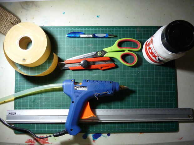 vamos a configurar el equipo. para este proyecto, estoy usando un cortador, tijeras, pegamento de pva, pegamento caliente, bolígrafo y algún cartón.