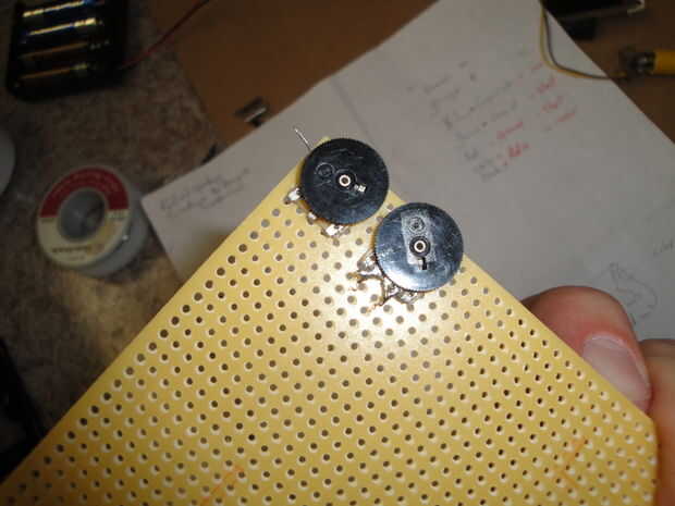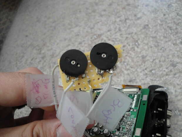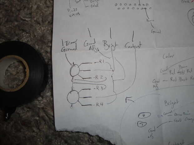 Con dos ollas condensador de ajuste finos de una vieja radio (control de volumen y frecuencia) y las 4 resistencias de la placa de control original de imagen pude que sea mucho más pequeño que controlaban sólo el brillo y el contraste. El color por defecto estaba bien pero el brillo era demasiado brillante y el contraste fue extraño. Tras el pinout de la Junta replican en el nuevo tablero de PC.