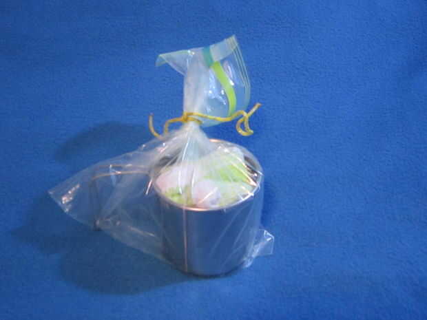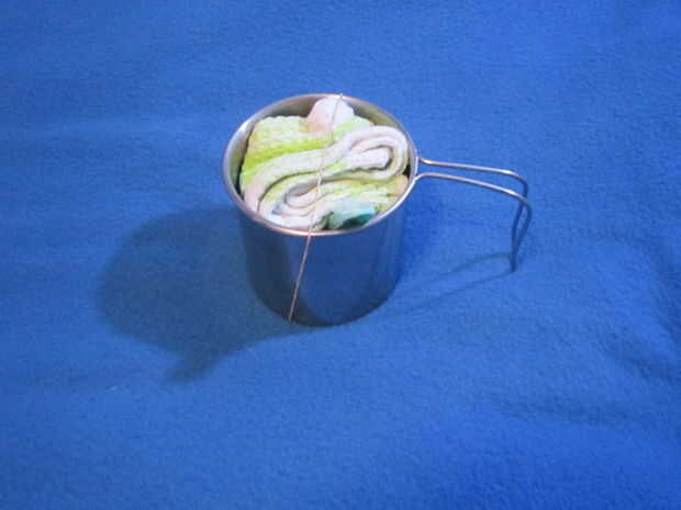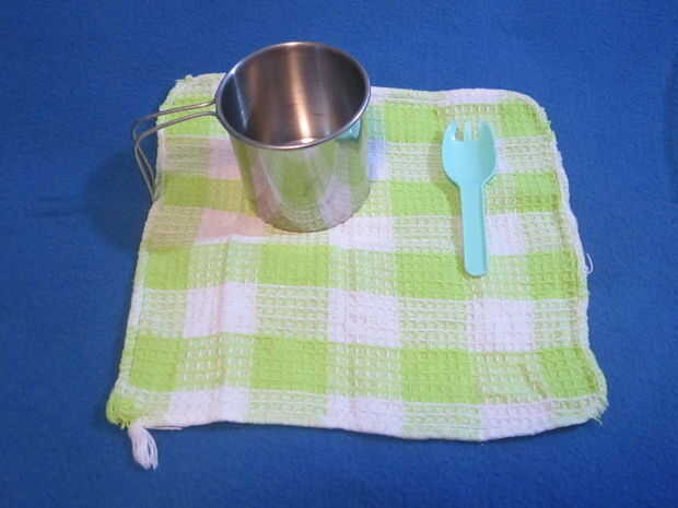 Kit del lío: Tacita acero inoxidable, paño plato, Spork, bolsita de azúcar, bolsa de chocolate caliente, 4 bolsitas de té, 2 bolsas de congelador para poner el kit entero y un clip del bolso de la viruta también hacen más compacto.