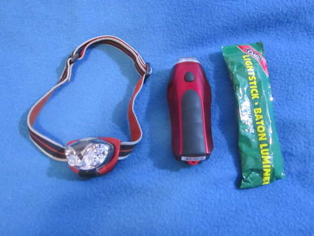 Luz: 1 buena linterna frontal con ajuste, 1 linterna de Dinamo, 1 palillo de gran resplandor rojo.