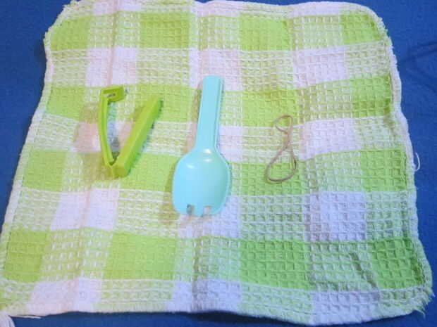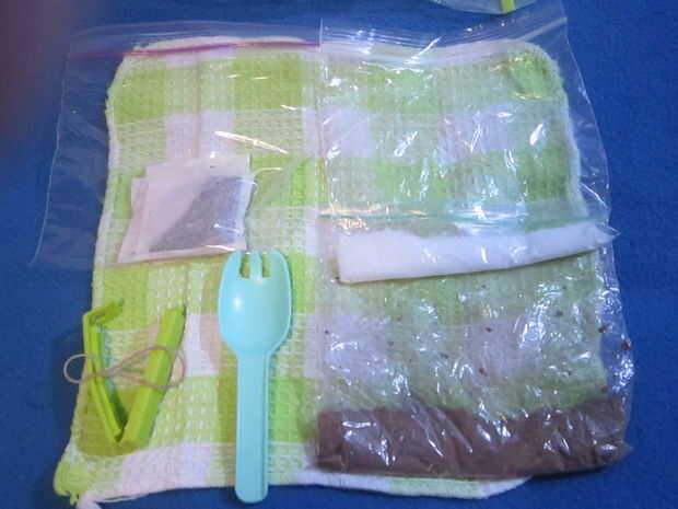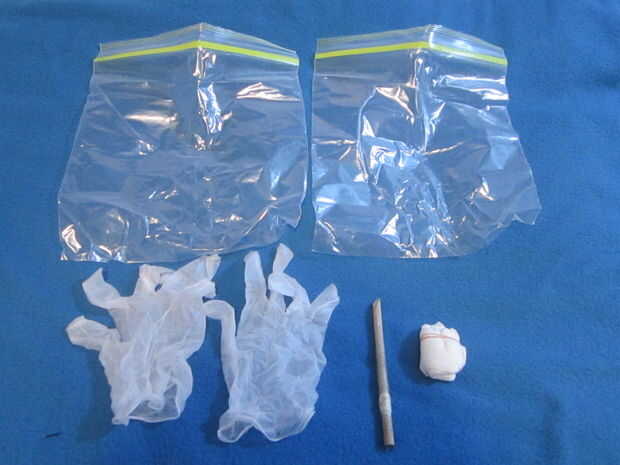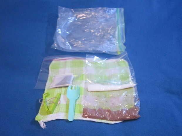 Colección y preparación de alimentos: 2 congelador bolsas Ziploc, 1 par de guantes de goma desechables, 1 pasador de madera envuelto con pesca cordeles con 1 gancho y una pequeña cantidad de toalla de papel.