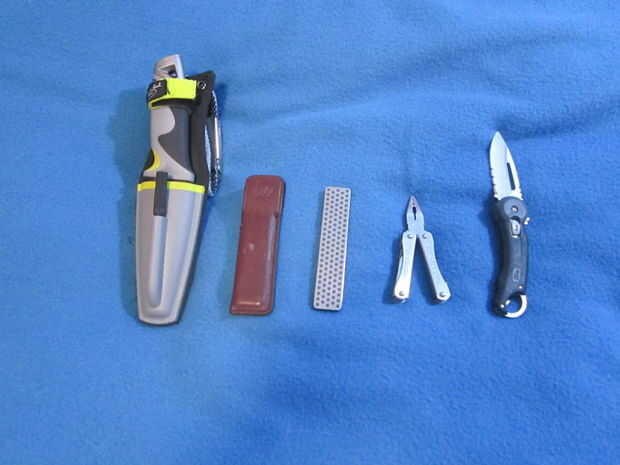 Herramientas: cuchillo de hoja fija 1 (cuchillo Ártico de les stroud Cammilus), 1 piedra afiladora de diamante D.M.T, 1 herramienta pequeña, mi cuchillo de E.D.C plegable (Navaja cortante en punta Buck rojo).