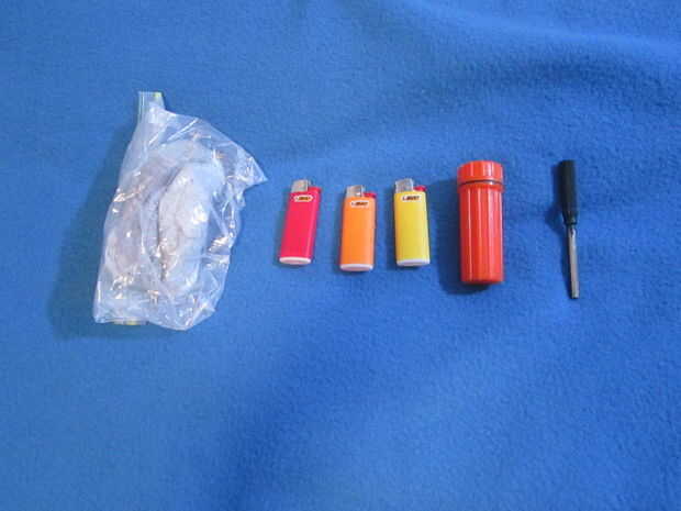 Fuego: 3 mecheros Mini Bic, alrededor de 25 partidos, pelusa de secadora y paño de carbón, acero del fuego.