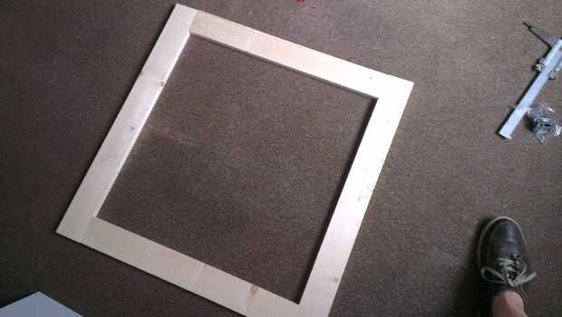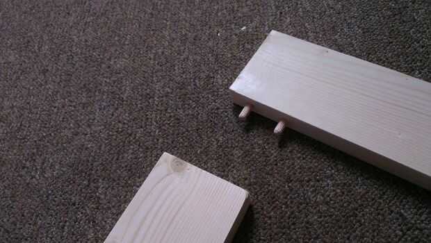 Taladre dos agujeros de 6mm en cada extremo de cada pedazo corto de madera para los tacos. Use pernos de pasador para marcar y taladrar los agujeros correspondientes en las piezas largas de madera. Pegamento clavijas en su lugar con pegamento para madera y armar el marco. Limpie inmediatamente cualquier exceso de abrazadera Junta (utilizar bandas elásticas para sostener juntos) y dejar durante 24 horas. Una vez seca, la arena de cualquier pegamento residual si es necesario. Terminar con el acabado deseado, utilicé Briwax sin aromatizantes para sacar el grano y añadir un brillo leve, pero puede utilizar cualquier pintura apropiado, mancha o barniz.