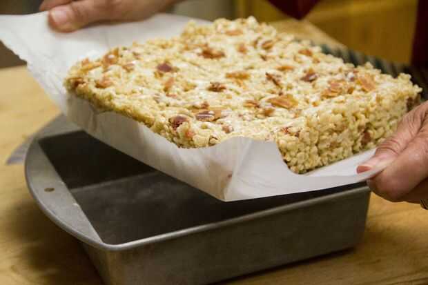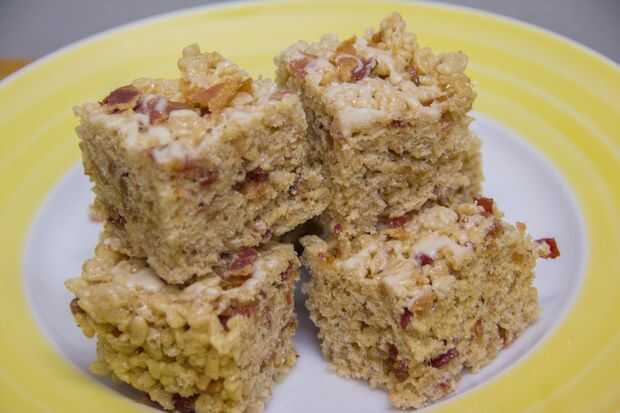 Rocía el glaseado bourbon sobre el sistema trata de Krispy de arroz. Luego Espolvoree los trozos restantes de tocino sobre la parte superior. Deje que se enfríe completamente en la sartén.