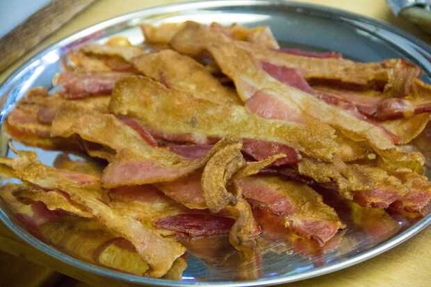 Cuando el bacon esté hecho, deben buscar oro y sobre todo crujiente. Borrado todo el tocino con una toalla de papel después de que salieron del horno para deshacerse de la grasa extra.