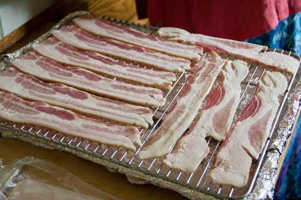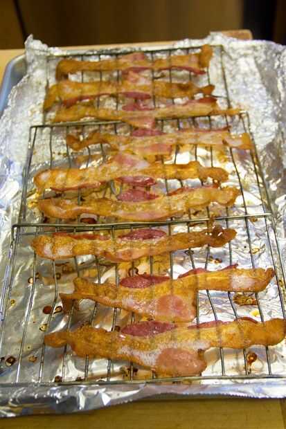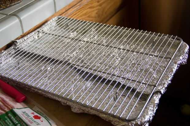 Ajuste el horno a 400 º f. Cubierta de 2 hojas para hornear con papel de aluminio (facilita para limpiar más tarde) y poner una rejilla metálica sobre él para que el tocino puede cocinar por ambos lados y no se sientan en su propia grasa. Asegúrese de que las tiras de tocino no se toquen.
